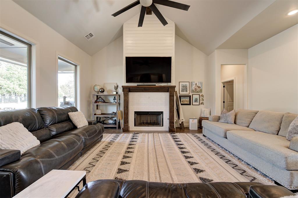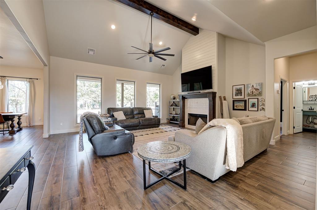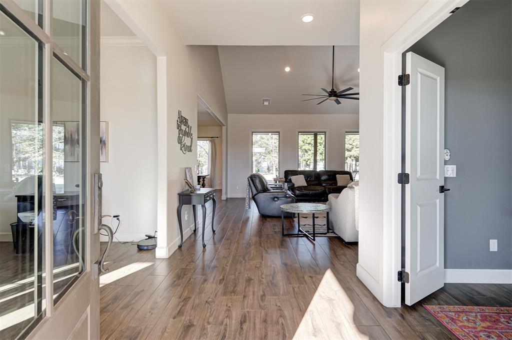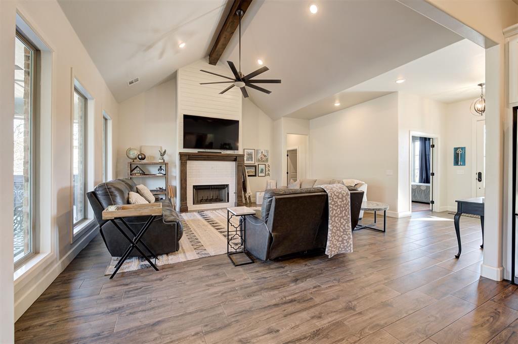 Built by Silverstone Homes in 2020, this home features wood look tile and classic neutral finishes throughout. The entry and living areas welcome you with vaulted ceilings and gorgeous wood work plus an open concept flex room with a wall of custom built-ins, bright kitchen and a large dining space. Oversized windows welcome in natural light and overlook your large backyard and a generous tree line for privacy. Every part of this home is perfect for daily living, from a half bathroom for guests, oversized laundry room with ample built in storage and a generous master suite with large walk in closet and luxurious bathroom.